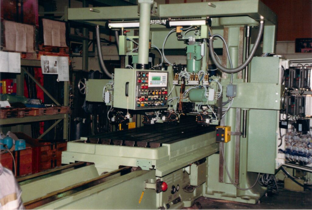Projektbeschreibung Auftragsumfang: Demontage des Zentralantriebes und Einzelachsen- Antrieb. Rundtisch auch CNC gesteuert. Anbau von Kugelrollspindeln in der X,Y und Z Achse. Neue, einzelne Vorschubachsmotoren. Konstruktion und Herstellung inkl. Montage durch die WIAP AG. Alter Elektroschrank entfernen. Alle Kabel entfernen. Anbau eines neuen Elektroschrankes. Neue Masstäbe einbauen. TTK Spindelmotor entfernen; neuer Motor anbauen. Alle defekten Teile reparieren und ersetzen. Anbau neuer CNC Steuerung. Schulung und Inbetriebnahme. An dieser Maschine war keine Garantieleistung erforderlich. Konstruktion und Herstellung inkl. Montage von WIAP AG.
