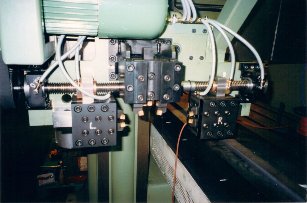 Bild 10 J: Seitlich links und rechts sind je 2 Stähle, oben und unten. Die beiden seitlichen Schlitten laufen mit einer links / rechts Spindel. So, dass sie immer zur Mitte laufen und nur ein Vorschubmotor diese 4 Stähle bewegen muss.