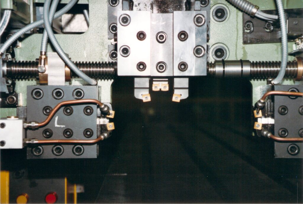 Bild 10 V: 4 CNC Achsen, wovon 2 Achsen eine Links / Rechts – Lauflösung eine Doppelfunktion ausführt, d.h. 4 Werkzeuge gleichzeitig pro Schlitten und es sind 2 Schlitten, d.h. 8 Werkzeuge spanen gleichzeitig ab.