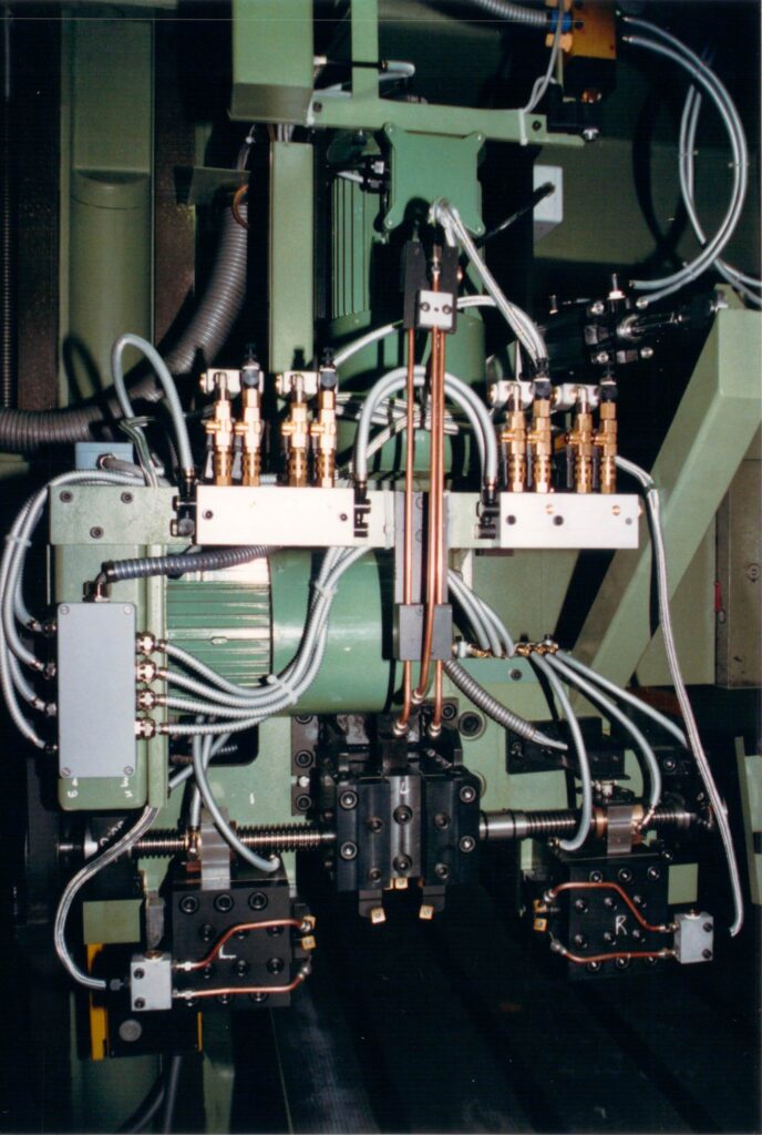 Bild 10 M: Das Schmiersystem wurde mit einer Minimalmengen Schmierung gelöst. Es wurden 4 Ventile dazu benötigt. Einmal waagrecht linker Schlitten, einmal senkrecht linker Schlitten; dann dasselbe beim rechten Schlitten.