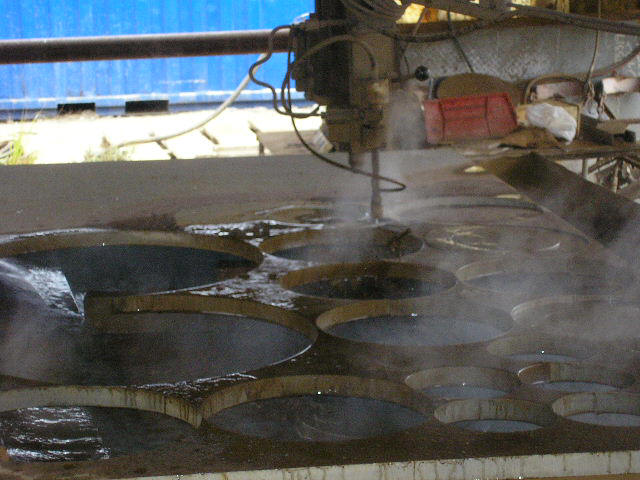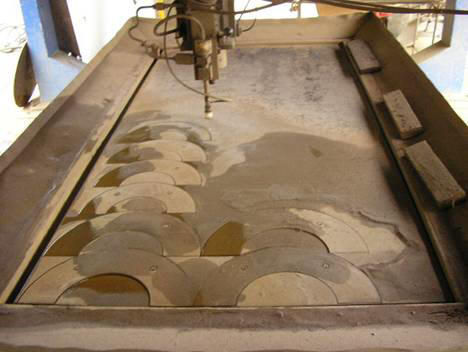 Bild 9 E: Hier der Arbeitsplatz der Wasserstrahl maschine. Es können Platten 3 x 4 Meter bearbeitet werden. Vor allem braucht es diese Maschine für das rostfreie Material, weil man das mit der Brennschneid Anlage (Qxy Cut) nicht kann.