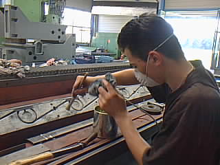 Bild 4 B: Der SKC Belag wird neu ausgegossen. Der WIAP Lehrling Burim beim Reinigen der Klebe- Ausgiessarbeit.