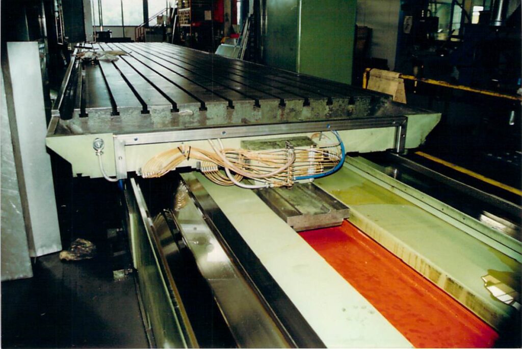 Grosshobel – Fräsmaschine Führungsbelag Umbau. Luftabhebung einbauen gegen Stick Slip Effekt = Haftgleiteffekt. Die (selbsterregte) Reibschwingung oder auch der Stick-Slip Effekt, bezeichnet das Ruckgleiten von gegeneinander bewegten Festkörpern.