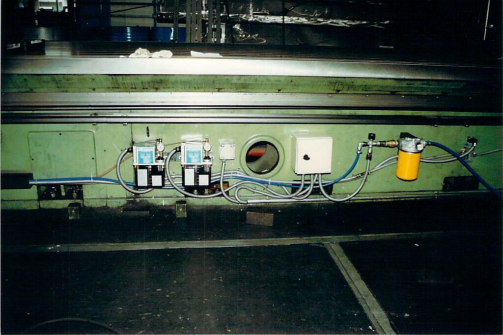 Bild 4 A: Schmierung an der Waldrich Hobelmaschine mit Luftunterstützung. Maschine machte Ruckbewegungen beim Fräsen und der sogenannte Stick-Slip Effekt musste beseitigt werden. Der Umbau dauerte 8 Arbeitstage.